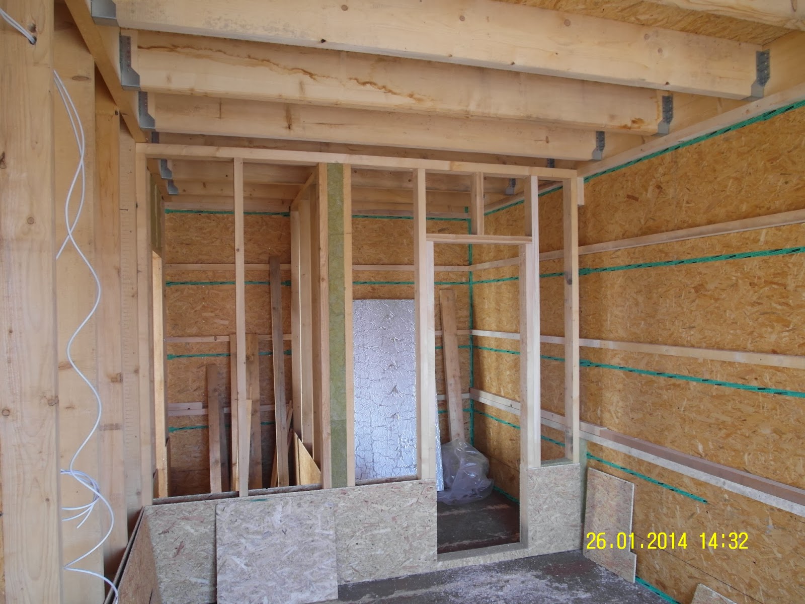 Instalační rošt uvnitř budovy slouží pro vedení veškerých rozvodů elektro,voda, data, TV atd. po domě. Je tam z důvodu, aby se nemuselo zasahovat do vzduchotěsné vrstvy, vrtat, řezat apod., v mojím případě do OSB desky. Zvolil jsem hranoly 60x50mm umístěné vodorovně. Tento rošt se po veškerých rozvodech vyplní izolační vatou. Zároveň jsem udělal vystužení pod kamna a pod schody. Dále jsem natahal rozvody TV, SAT, Internet, kabel k čidlům pro topení. Udělal jsem to trochu jinak než se dělá a to tak, že všechno je natahané natvrdo v příčkách a roštech až na střechu a husí krky jsou prázdné pro případ dalších rozvodů.
